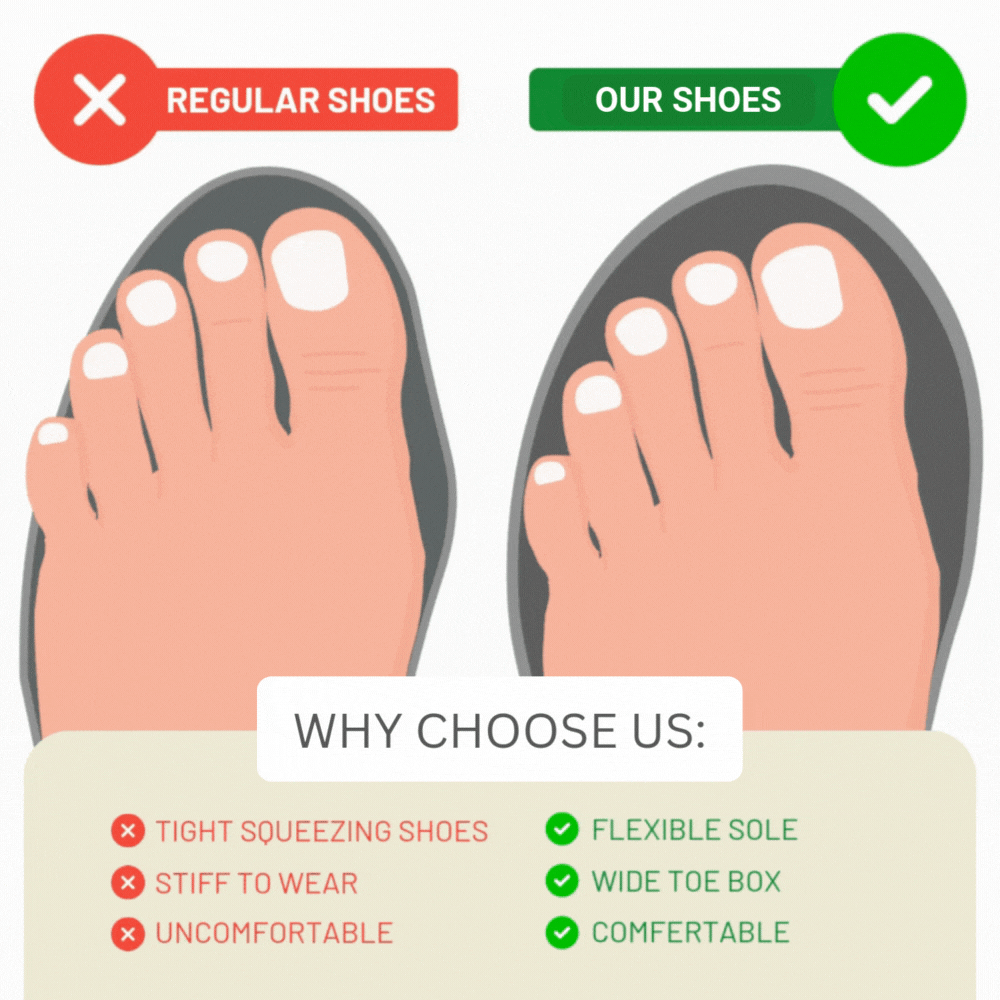 ✓ Großzügige Zehenbox - Die geräumige Zehenbox ermöglicht es Ihren Zehen, sich natürlich auszuruhen, ohne Krämpfe oder Druck zu verursachen. Dadurch werden Schmerzen durch Ballenzehen, Hammerzehen und Schwellungen reduziert und gleichzeitig ganztägiger Tragekomfort gefördert.